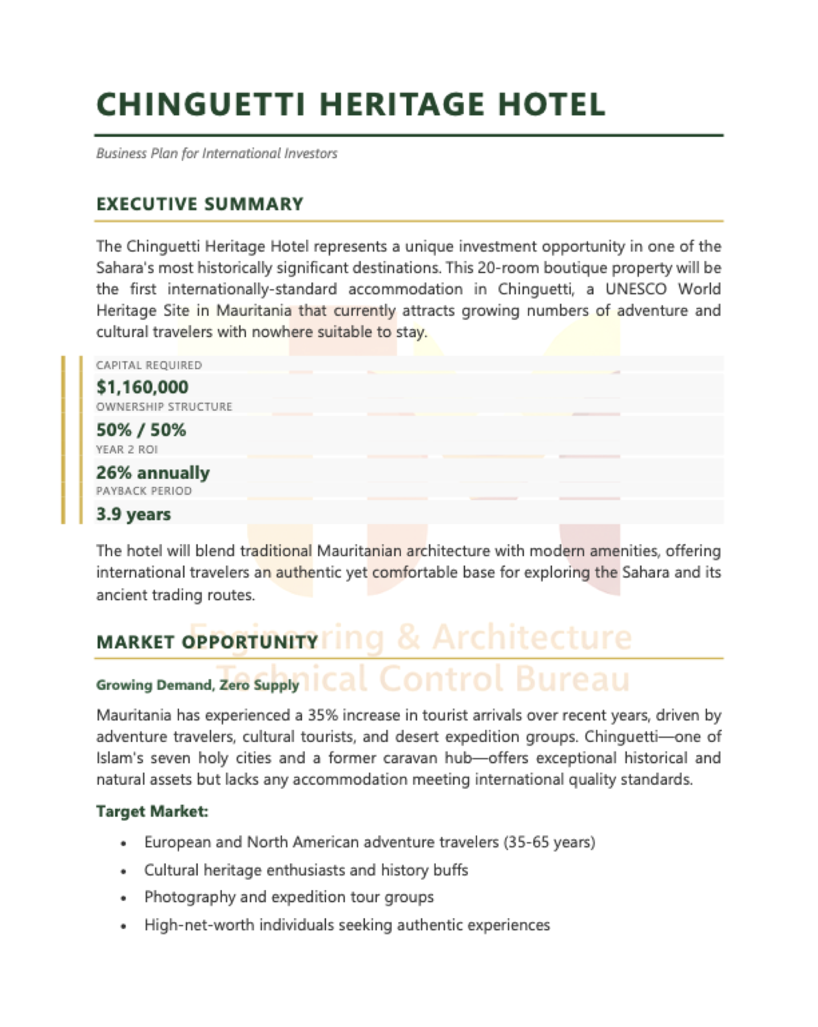 Join us in creating Mauritania's first luxury heritage hotel. With first-mover advantage in a protected UNESCO zone and growing tourism demand (35% increase), Adrar Hotel offers exceptional ROI potential with minimal competition.